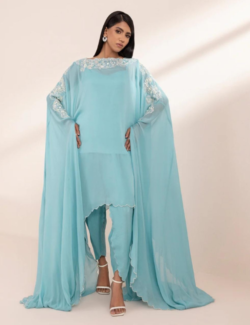 Step into effortless elegance with our Bfresh 2-piece set, featuring a breezy chiffon cap shirt designed without lining for a lightweight, airy feel. Paired with a stylish raw silk tulip shalwar, this outfit blends contemporary cuts with traditional charm, perfect for summer soirées or casual day outs.